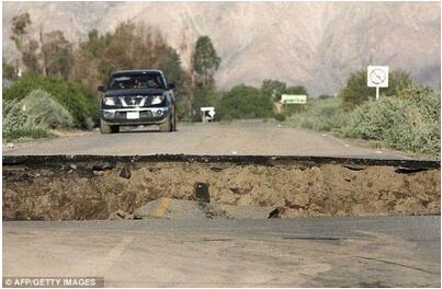 地震給地面造成的破壞:大地震后,墨西哥城市墨西卡利公路上出現(xiàn)一條大裂縫。